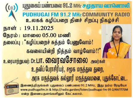 புதுக்கோட்டை, அரசு மருத்துவக் கல்லூரி மருத்துவமனை, சமூக மருத்துவ துறை, உதவிப் பேராசிரியர், Dr.பா. வைரவசோலை அவர்கள். “கழிப்பறைச் சுத்தம் பேணுவோம்! கவலையின்றி நித்தம் வாழ்வோம்!!” என்ற தலைப்பில் வழங்கிய உரையாடல்.