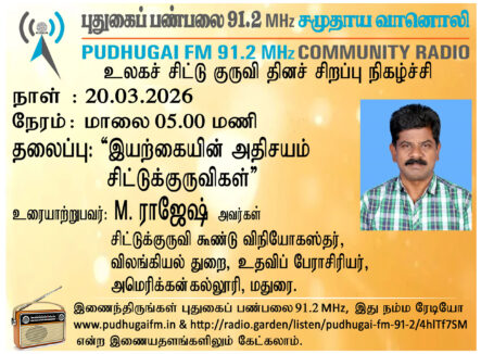 மதுரை, அமெரிக்கன் கல்லூரி, உதவிப்பேராசிரியர், விலங்கியல் துறை,  சிட்டுக்குருவி கூண்டு வினியோகஸ்தர்,M. ராஜேஷ் அவர்கள். “இயற்கையின் அதிசயம் சிட்டுக்குருவிகள்” என்ற தலைப்பில் வழங்கிய உரையாடல்.