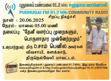 திருநெல்வேலி மாவட்டம், களக்காடு, விவசாயி, திரு D. சாம் பெனில் அவர்கள். “தேனீ வளர்ப்பு முறைகளும், பொருளாதார முன்னேற்றமும்”