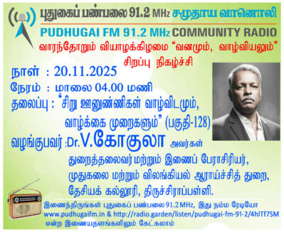 திருச்சிராப்பள்ளி, தேசியக் கல்லூரி, முதுகலை மற்றும் விலங்கியல் ஆராய்ச்சித் துறை, துறைத்தலைவர் மற்றும் இணைப் பேராசிரியர், Dr V.கோகுலா அவர்கள். “சிறு ஊனுண்ணிகள் வாழ்விடமும், வாழ்க்கை முறைகளும்” (வனமும் வாழ்விகளும் -பகுதி 128) என்ற தலைப்பில் வழங்கிய உரை.