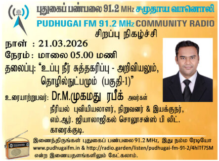 காரைக்குடி, எம். ஆர். ஜியாலஜிக்கல் சொலூசன்ஸ் பி லிட். நிறுவனர் மற்றும் இயக்குநர், நீரியல் புவியியலாளர், Dr.M.முகமது ரபீக் அவர்கள். “உப்பு நீர் சுத்திகரிப்பு- அறிவியலும், தொழில்நுட்பமும் (பகுதி -01)” என்ற தலைப்பில் வழங்கிய உரையாடல்.
