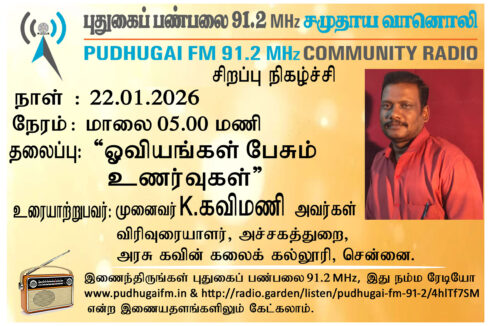 சென்னை, அரசு கவின் கலைக் கல்லூரி, அச்சகத்துறை, விரிவுரையாளர், முனைவர். K.கவிமணி அவர்கள். “ஓவியங்கள் பேசும் உணர்வுகள்” என்ற தலைப்பில் வழங்கிய உரையாடல்.