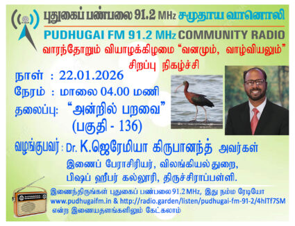 திருச்சிராப்பள்ளி, பிஷப் ஹீபர் கல்லூரி, விலங்கியல் துறை, இணைப் பேராசிரியர், Dr. K. ஜெரேமியா கிருபானந்த் அவர்கள். “அன்றில் பறவை” (வனமும் வாழ்வியலும்-136) என்ற தலைப்பில் வழங்கிய உரை.