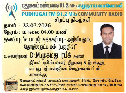 காரைக்குடி, எம். ஆர். ஜியாலஜிக்கல் சொலூசன்ஸ் பி லிட். நிறுவனர் மற்றும் இயக்குநர், நீரியல் புவியியலாளர், Dr.M.முகமது ரபீக் அவர்கள். “உப்பு நீர் சுத்திகரிப்பு- அறிவியலும், தொழில்நுட்பமும் (பகுதி -02)” என்ற தலைப்பில் வழங்கிய உரையாடல்.