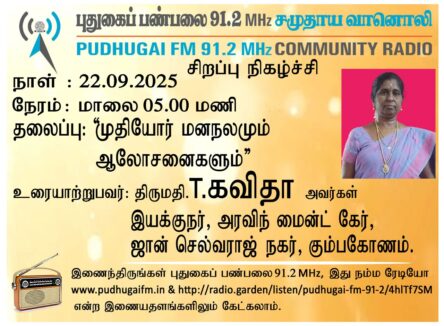 கும்பகோணம், ஜான் செல்வராஜ் நகர், அரவிந் மைன்ட் கேர், இயக்குநர், திருமதி T.கவிதா அவர்கள். “முதியோர் மனநலமும் ஆலோசனைகளும்” என்ற தலைப்பில் வழங்கிய உரையாடல்.