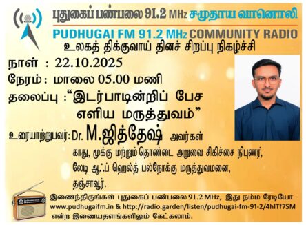 தஞ்சாவூர், லேடி ஆஃப் ஹெல்த் பல்நோக்கு மருத்துவமனை, காது, மூக்கு மற்றும் தொண்டை அறுவை சிகிச்சை நிபுணர்,Dr.M. .ஜிதேஷ் அவர்கள். “இடர்பாடின்றிப் பேச எளிய மருத்துவம்” என்ற தலைப்பில் வழங்கிய உரையாடல்.