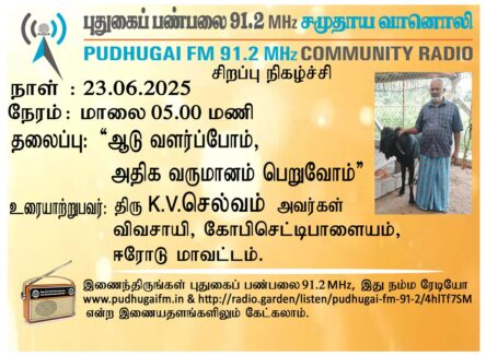ஈரோடு மாவட்டம், கோபிசெட்டிபாளையம் விவசாயி, திரு K.V.செல்வம் அவர்கள். “ஆடு வளர்ப்போம், அதிக வருமானம் பெறுவோம்” என்ற தலைப்பில் வழங்கிய உரையாடல்.