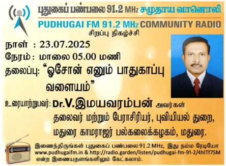மதுரை, மதுரை காமராஜர் பல்கலைக்கழகம், புவியியல் துறை, தலைவர் மற்றும் பேராசிரியர், Dr. V.இமயவரம்பன் அவர்கள். “ஓசோன் எனும் பாதுகாப்பு வளையம்” என்ற தலைப்பில் வழங்கிய உரையாடல்.