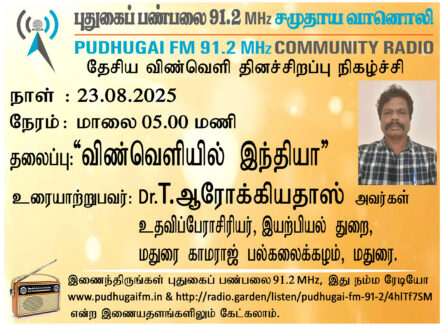 மதுரை, மதுரை காமராஜ் பல்கலைக்கழகம், இயற்பியல் துறை, உதவிப்பேராசிரியர், Dr.T.ஆரோக்கியதாஸ் அவர்கள். “விண்வெளியில் இந்தியா” என்ற தலைப்பில் வழங்கிய உரையாடல்.