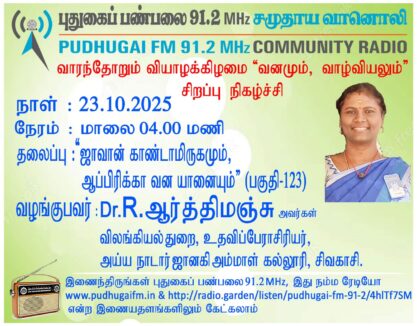 சிவகாசி, அய்ய நாடார் ஜானகி அம்மாள் கல்லூரி, உதவிப்பேராசிரியர், விலங்கியல் துறை, Dr.R.ஆர்த்திமஞ்சு அவர்கள். “ஜாவான் காண்டாமிருகமும், ஆப்பிரிக்கா வன யானையும்” (வனமும் வாழ்வியலும்- பகுதி 123) என்ற தலைப்பில் வழங்கிய உரை.