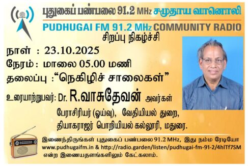 மதுரை, தியாகராஜர் பொறியியல் கல்லூரி, வேதியியல் துறை, பேராசிரியர் (ஓய்வு), Dr.R.வாசுதேவன் அவர்கள். “நெகிழிச் சாலைகள்” என்ற தலைப்பில் வழங்கிய உரையாடல்.