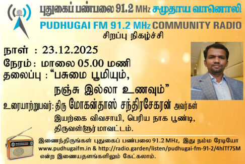 திருவள்ளூர் மாவட்டம், பெரிய நாக பூண்டி, இயற்கை விவசாயி, திரு மோகன்தாஸ் சந்திரசேகரன் அவர்கள். “பசுமை பூமியும், நஞ்சு இல்லா உணவும்” என்ற தலைப்பில் வழங்கிய உரையாடல்.
