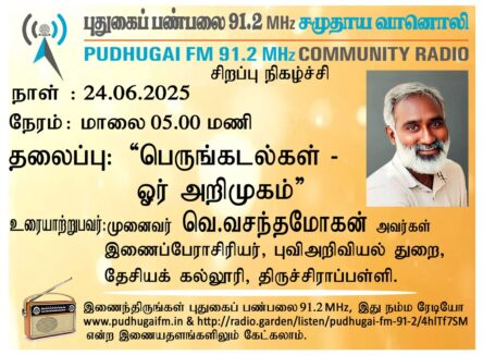 திருச்சிராப்பள்ளி, தேசியக் கல்லூரி, புவிஅறிவியல் துறை, இணைப்பேராசிரியர், முனைவர் வெ. வசந்தமோகன் அவர்கள். “பெருங்கடல்கள்- ஓர் அறிமுகம்” என்ற தலைப்பில் வழங்கிய உரையாடல்.