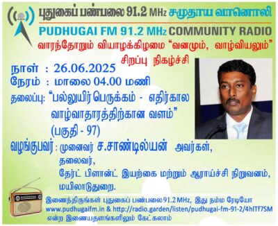 மயிலாடுதுறை, தேர்ட் பிளான்ட் இயற்கை மற்றும் ஆராய்ச்சி நிறுவனம், தலைவர், முனைவர் ச. சாண்டில்யன் அவர்கள். “பல்லுயிர்பெருக்கம் – எதிர்கால வாழ்வாதாரத்திற்கான வளம் (வனமும் வாழ்வியலும்-96)” என்ற தலைப்பில் வழங்கிய உரை.