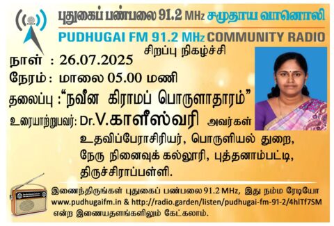 திருச்சிராப்பள்ளி, புத்தனாம்பட்டி, நேரு நினைவுக் கல்லூரி,, பொருளியல் துறை, உதவிப்பேராசிரியர், Dr. V. காளீஸ்வரி அவர்கள், “நவீன கிராமப் பொருளாதாரம்” என்ற தலைப்பில் வழங்கிய உரையாடல்.