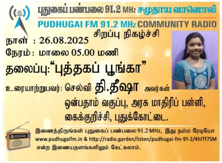 புதுக்கோட்டை, கைக்குறிச்சி, அரசு மாதிரிப் பள்ளி, ஒன்பதாம் வகுப்பு, செல்வி தி. தீஷா அவர்கள்.” புத்தகப் பூங்கா” என்ற தலைப்பில் வழங்கிய உரையாடல்.