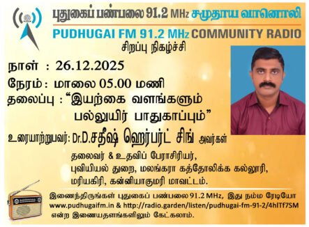 கன்னியாகுமரி மாவட்டம், மரியகிரி, மலம்கரா கத்தோலிக்க கல்லூரி, புவியியல் துறை, தலைவர் மற்றும் உதவிப் பேராசிரியர், Dr.D.சதீஷ் ஹெர்பர்ட் சிங் அவர்கள். “இயற்கை வளங்களும் பல்லுயிர் பாதுகாப்பும்” என்ற தலைப்பில் வழங்கிய உரையாடல்.