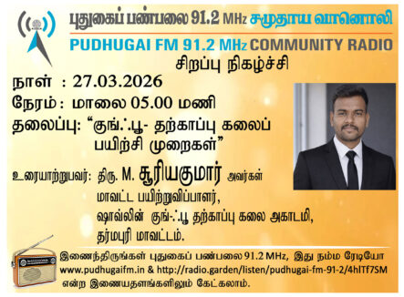 தர்மபுரி மாவட்டம், ஷாவ்லின் குங்ஃபூ தற்காப்பு கலை அகாடமி, மாவட்ட பயிற்றுவிப்பாளர், திரு M. சூரியகுமார் அவர்கள். “குங்-ஃபூ தற்காப்பு கலைப் பயிற்சி முறைகள்” என்ற தலைப்பில் வழங்கிய உரையாடல்.