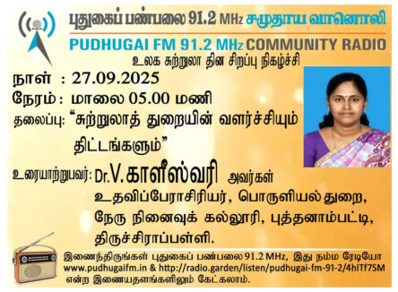 திருச்சிராப்பள்ளி, புத்தனாம்பட்டி, நேரு நினைவுக் கல்லூரி,, பொருளியல் துறை, உதவிப்பேராசிரியர், Dr. V. காளீஸ்வரி அவர்கள், “சுற்றுலாத் துறையின் வளர்ச்சியும் திட்டங்களும்” என்ற தலைப்பில் வழங்கிய உரையாடல்.