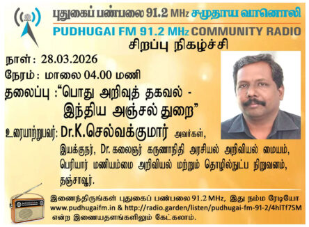 தஞ்சாவூர், பெரியார் மணியம்மை அறிவியல் மற்றும் தொழில்நுட்ப நிறுவனம், டாக்டர் கலைஞர் கருணாநிதி அரசியல் அறிவியல் மையம், இயக்குநர் Dr.K.செல்வக்குமார் அவர்கள் “பொது அறிவு தகவல்- இந்திய அஞ்சல் துறை”என்ற தலைப்பில் வழங்கிய உரை.
