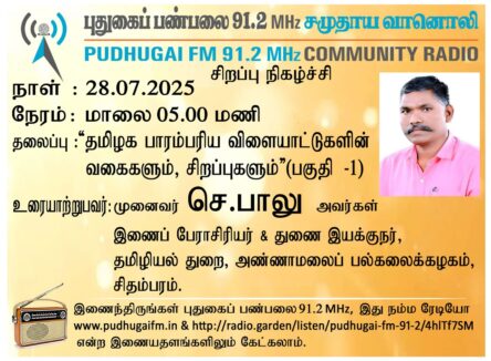 சிதம்பரம், அண்ணாமலைப் பல்கலைக்கழகம், தமிழில் துறை, இணை பேராசிரியர் & துணை இயக்குனர், முனைவர் செ. பாலு அவர்கள். “தமிழக பாரம்பரிய விளையாட்டுகளின் வகைகளும், சிறப்புகளும்” (பகுதி-1) என்ற தலைப்பில் வழங்கிய உரையாடல்.*******