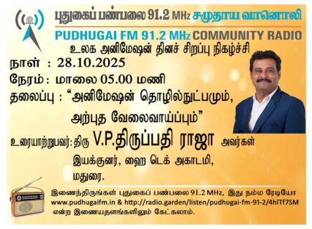 மதுரை, ஹை டெக் அகாடமி, இயக்குனர், திரு V.P.திருப்பதி ராஜா அவர்கள். “அனிமேஷன் தொழில்நுட்பமும், அற்புத வேலைவாய்ப்பும்”என்ற தலைப்பில் வழங்கிய உரையாடல்.