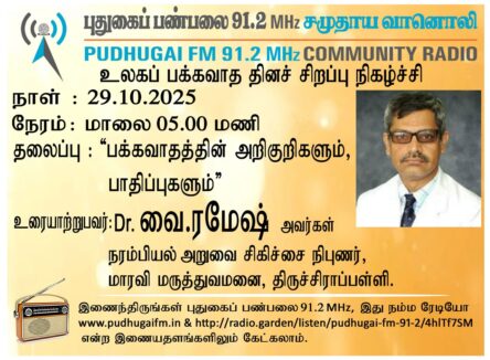 திருச்சிராப்பள்ளி, மாரவி மருத்துவமனை, நரம்பியல் அறுவை சிகிச்சை நிபுணர், Dr. வை.ரமேஷ் அவர்கள். “பக்கவாதத்தின் அறிகுறிகளும், பாதிப்புகளும்” என்ற தலைப்பில் வழங்கிய உரையாடல்.
