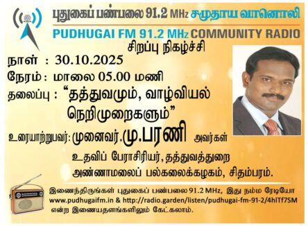சிதம்பரம், அண்ணாமலைப் பல்கலைக்கழகம், தத்துவத்துறை, உதவிப் பேராசிரியர், முனைவர் மு. பரணி அவர்கள். “தத்துவமும், வாழ்வியல் நெறிமுறைகளும்” என்ற தலைப்பில் வழங்கிய உரையாடல்.